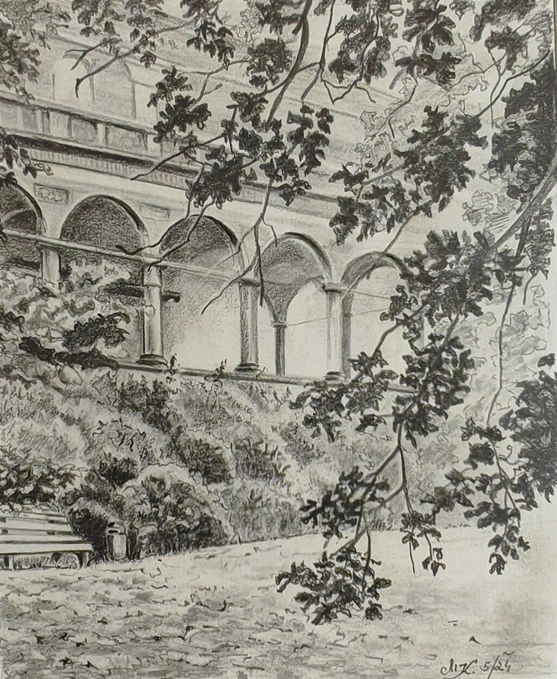 kresba "Letohrádek královny Anny, Praha", kresba tužkou podle fotografie Josefa Sudka